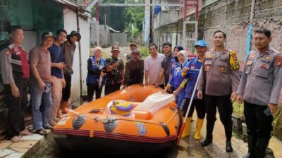 Kapolsek Bojongsari dan Anggota Polsek Bersama Team Tagana Beraksi di Lokasi Banjir